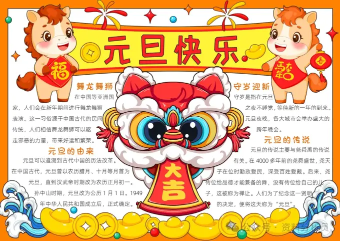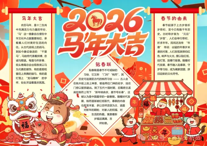 马年春节主题手抄报模板,包含卡通小马、红灯笼、鞭炮等传统节日元素,适合小学生寒假作业使用。Word格式可随意编辑修改高清...